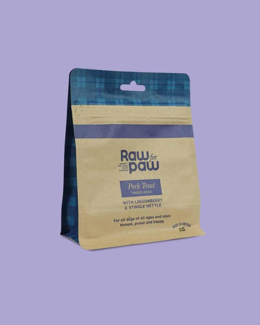 Raw for Paw Pork Treat är ett frystorkat hundgodis av gris, berikat med lingon och nässla. De mjuka bitarna är smidiga för hunden att tugga och för dig att bryta i mindre bitar. Ett belöningsgodis som passar hundar i alla åldrar!