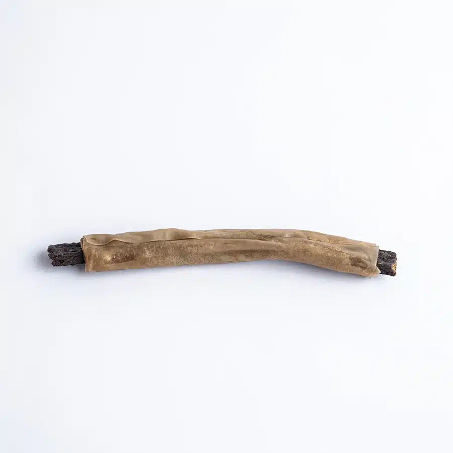 Ett tuggben tillverkat av renskinn och fyllning av torkat nötkött från Sverige.