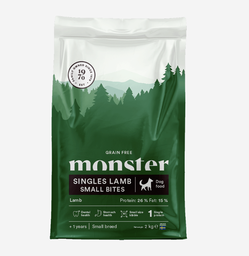 Monster Singles Lamb small bites är ett spannmålsfritt torrfoder med hög kötthalt och smakrikt innehåll. Perfekt för vuxna och normalaktiva hundar av mindre raser som mår bra av att enbart äta en proteinkälla! Fodret är extra anpassat till små raser då bitarna är mindre.
