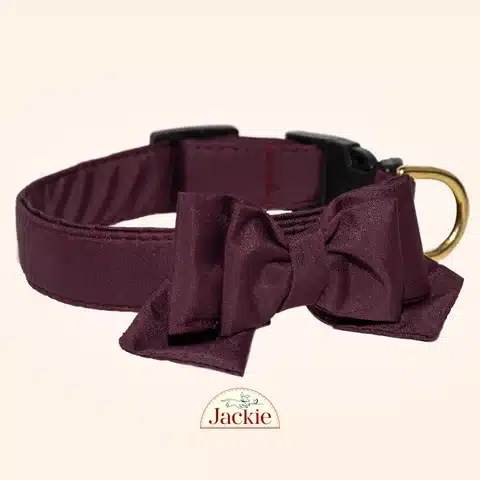 Jackies halsband med dekorativ rosett är gjort av ett textilklätt nylonband  med beslag i masssiv mässing och maskintvättbart i 40 grader.