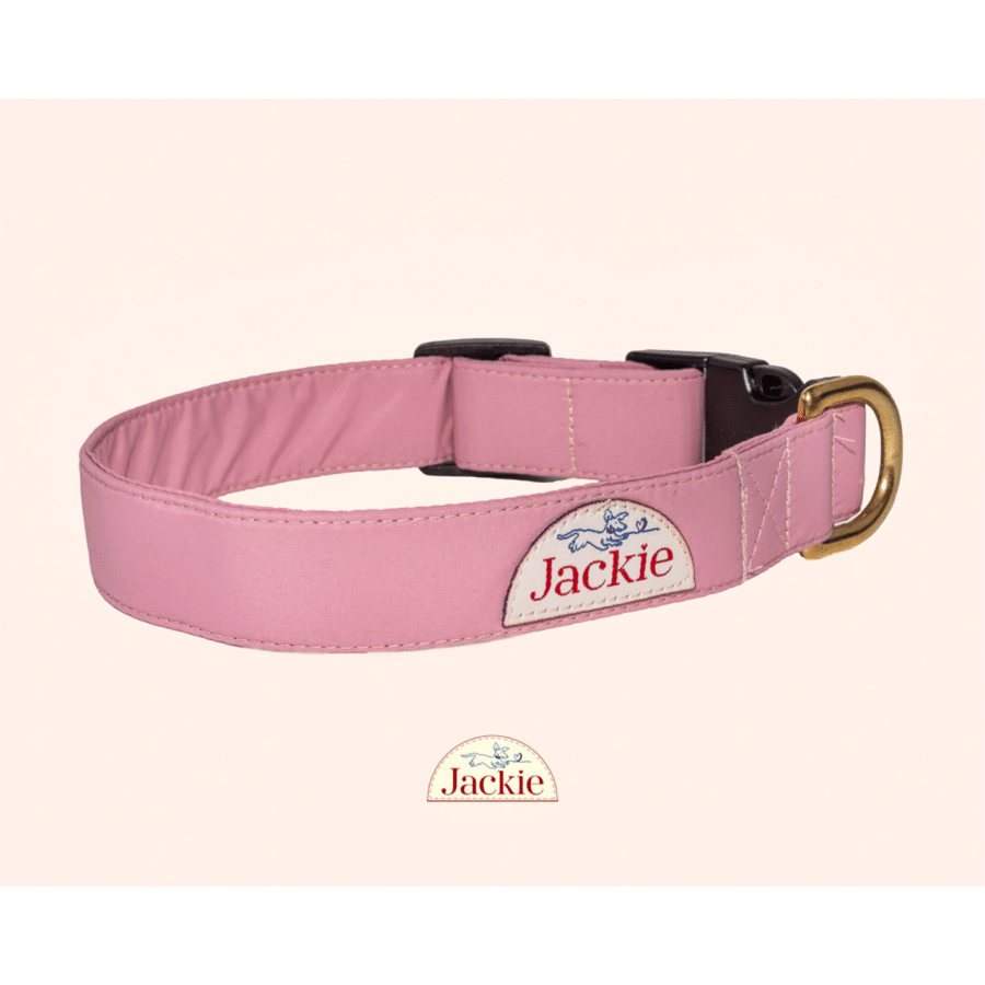 Jackies halsband är gjort av textilklätt nylonband med beslag i masssiv mässing och maskintvättbart i 40 grader.