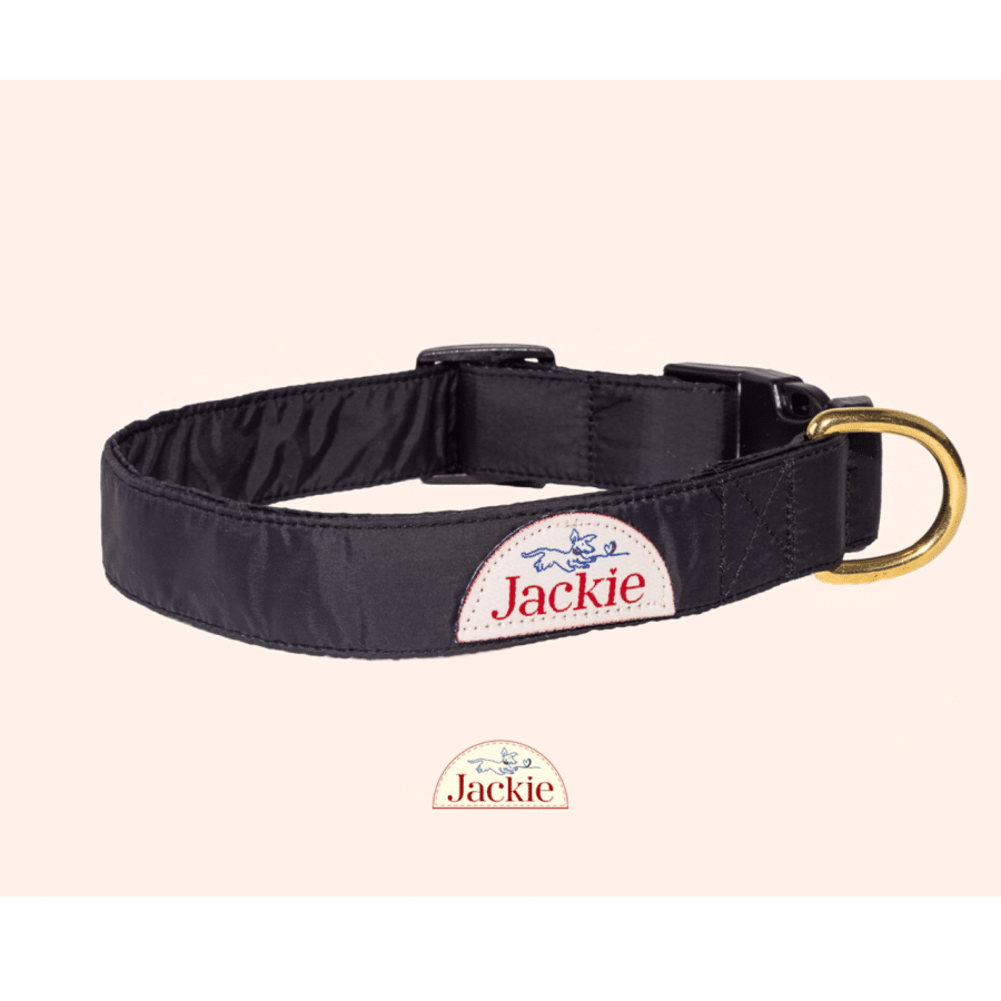 Jackies halsband är gjord av textilklätt nylonband  med beslag i masssiv mässing och maskintvättbart i 40 grader.