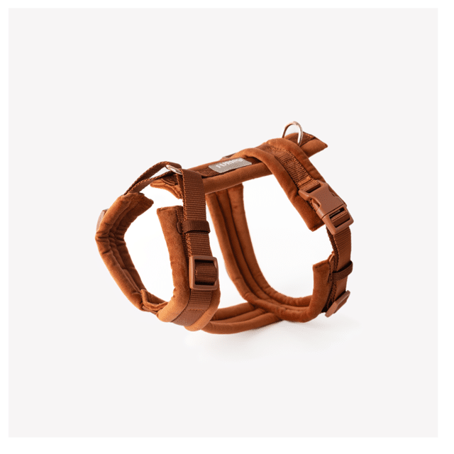 Sammetsselen är gjord med polyester- och sammetsremmar samt ett andningsbart tyg som vadderar remmarna för optimal komfort för din hund under promenaderna.